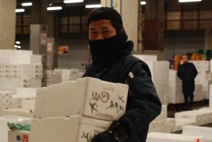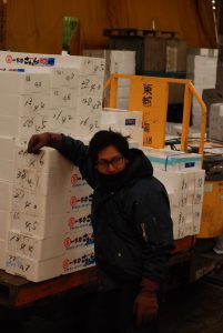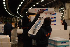 豊洲市場内にて、仲卸等へ新鮮な魚介類、加工品等をターレットトラックという
